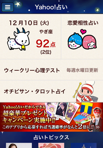 Yahoo!占いは、星座別の今日の運勢や恋愛運を含め、タロット占いや心理テストまで様々な占いコンテンツを楽しめるYahoo!公式アプリです。ウェブサイトのブラウザからもYahoo!占いにはアクセスできますが、アプリの方がすっきりしたデザインで、目的の占いを探しやすいでしょう。