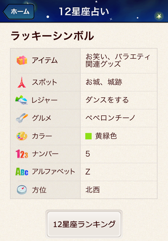 また、今日の運勢では今日の「ラッキーシンボル」をチェックできます。ラッキーシンボルには、よく他の占いにもあるアイテムやカラーの他にも、場所、食べ物、方位とバリエーションが豊富です。私はよくラッキーシンボルをお出かけの際に参考にしており、洋服やアクセサリーにラッキーカラーを取り入れたり、週末遊びに行く場所が決まらない時はラッキースポットや方位にお任せしたりしています。ファッションやレジャーに困ったら、ラッキーシンボルを参考にしてみてはいかがでしょうか。