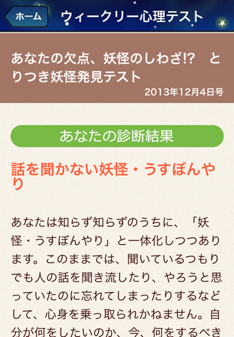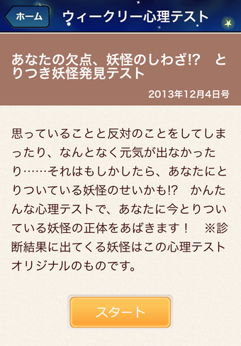Yahoo!占いにある心理テストは毎週水曜日に更新され、「クリスマスまでもう少し!あなたの恋愛に今必要なもの診断」など旬な内容の心理テストを楽しめます。どれも設問に対して一番当てはまる選択肢を答えるシンプルな診断ですが、個人的になかなか的中しているなと感じました。試してみたら、的中していたかどうか感想を、ユーザーレビューとして投稿してみてはいかがでしょうか。